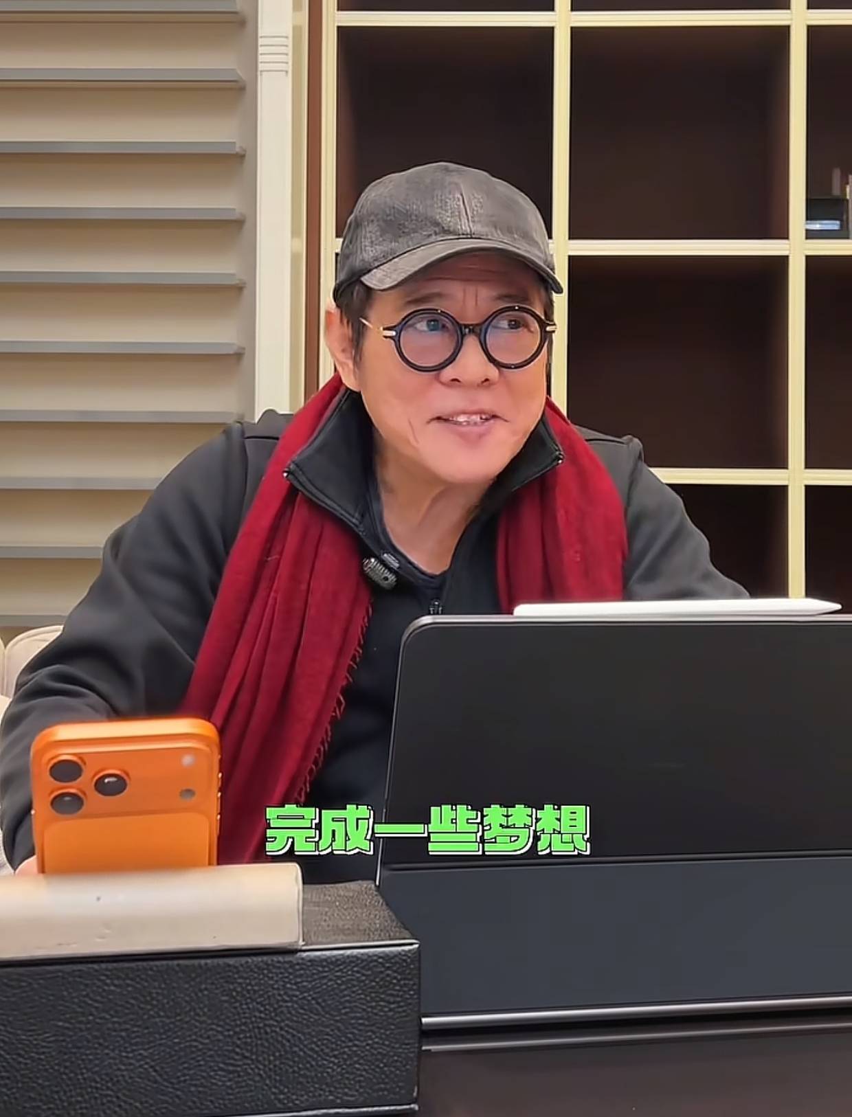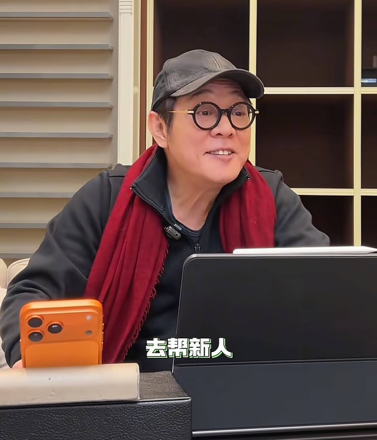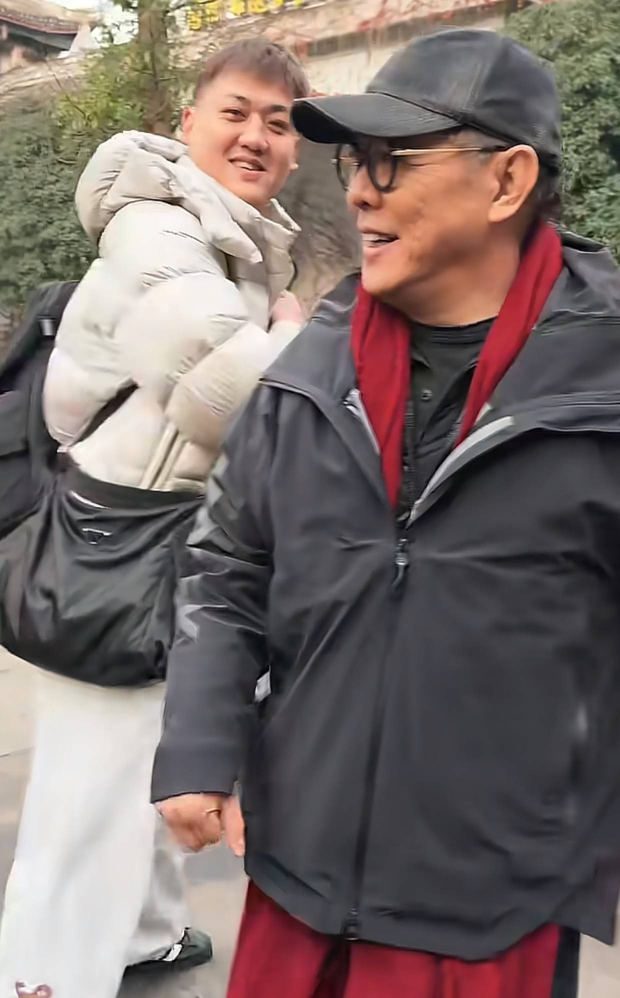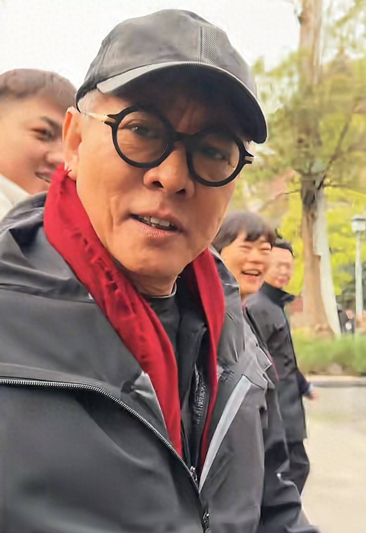现场流出的视频里,李连杰的穿着打扮十分朴素,黑色的羽绒服,头上戴着黑色的鸭舌帽,脖子上戴着红色的围巾。